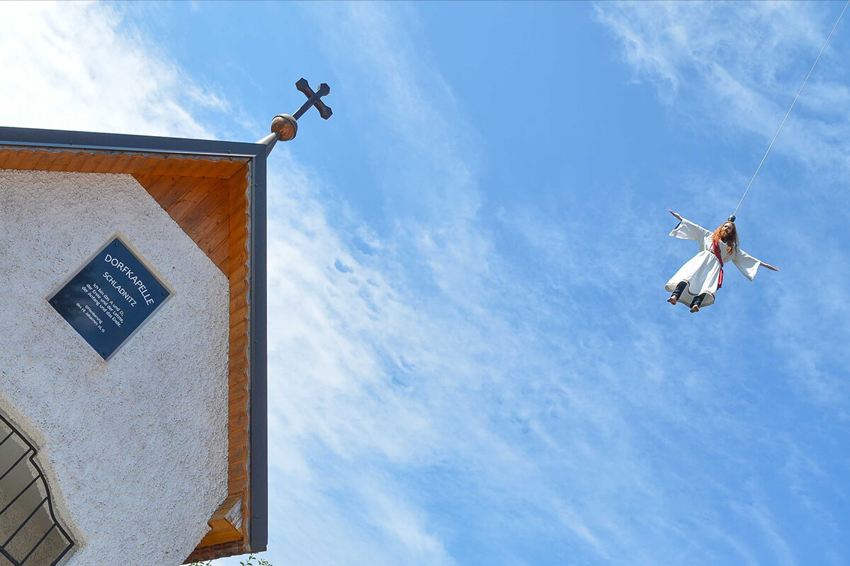 Pünktlicher als ein deutsches Handtuch auf der Liege im All-inclusive-Hotel landete der Area 53 Jesus am Samstag um exakt 10:00 Uhr aus 35 Meter Höhe heranfliegend vor der legendären Jesus-Kapelle am Campingplatz Deluxe – und das vor hunderten mit Sonnenbrand getarnter Metalheads. Was vor Jahren als Scherz des Veranstalters begann, ist heute Kult und ein festes Ritual des Festivals - das natürlich mit einem Augenzwinkern gesehen werden soll. Ungefähr 1000 Metal-Fans haben sich zum traditionellen Headbanger-Marsch zum Frühschoppen am Festivalgelände versammelt – stilecht mit Bierdose in der Hand und legendären Gesten.